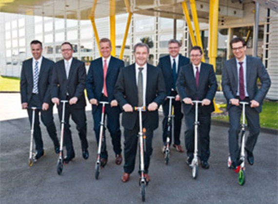 l. to r.: Tobias Vogel, Head of Sales & Marketing Bearings; Michael Blaß, Vice President, Head of Sales & Marketing e-chain systems®; Frank Blase, CEO; Gerhard Baus, Vice President, Head of Business Unit Polymer Bearings; Artur Peplinski, Vice President, Head of International Group Development & Marketing; Harald Nehring, Vice President, Head of Business Unit e-chain systems®; Christoph Müller, Vice President, Head of Finance and Controlling