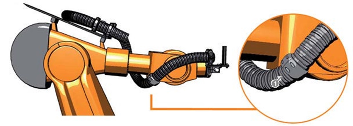 Fastening on the additional axis on the robot. Strain relief through CFX strain relief clips on the double C rails