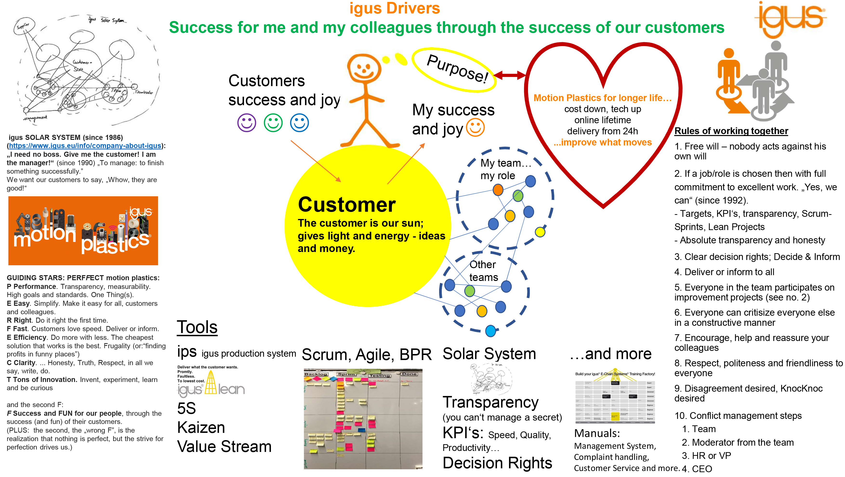 The igus drivers show on one page what we need as orientation and tools for our work. In addition to the solar system, the drivers contain the guiding star "Perffect" for our customers as well as rules for internal cooperation. Our ultimate goal: the success of our colleagues through the success of our customers!